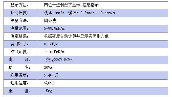 儀器符合GB/T6541的標準,采用圓環法在非平衡的條件下測量各種液體表麵張力(液—氣相界麵)及礦物油與水的界麵張力(液—液相界麵)。該儀器采用了微處理技術,自動化程度高、操作簡便、工作可靠。被測樣品注入杯後,隻要按動啟動鍵,儀器便可自動完成對試樣的測量,並能自動根據輸入的具體參數計算出被測試樣的張力值。